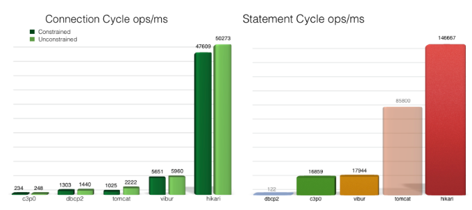 - 두 번째로 높은 Vibur도 5,651 ~ 5,960 ops/ms로 HikariCP의 1/10 수준에 불과하다